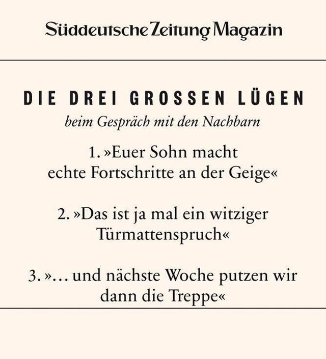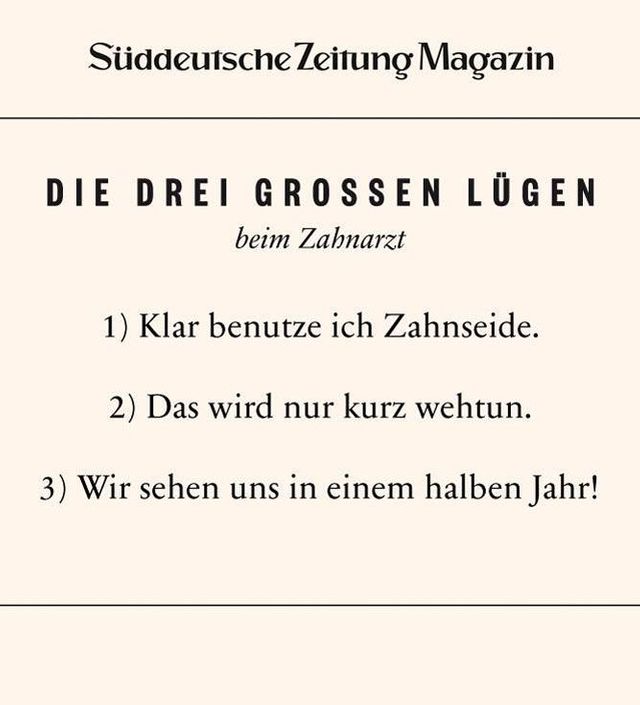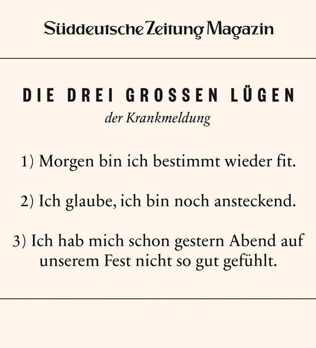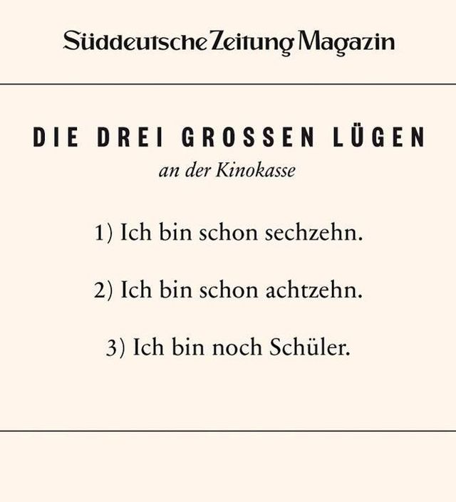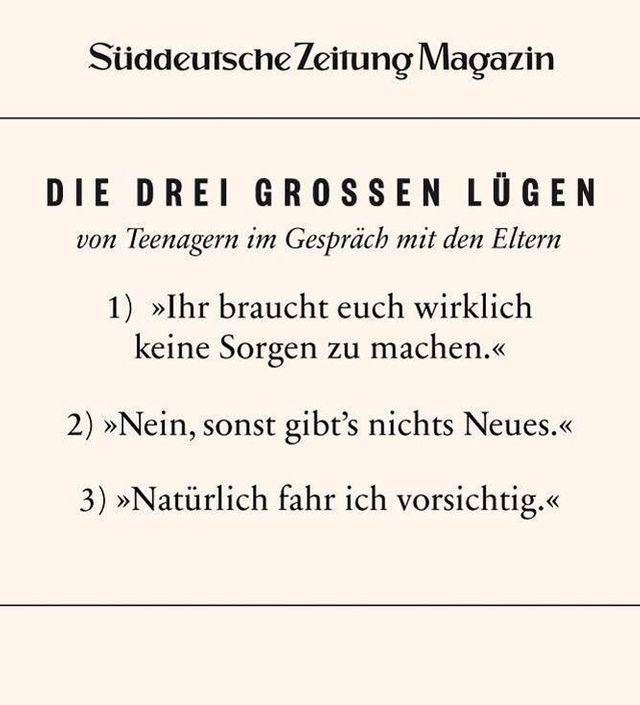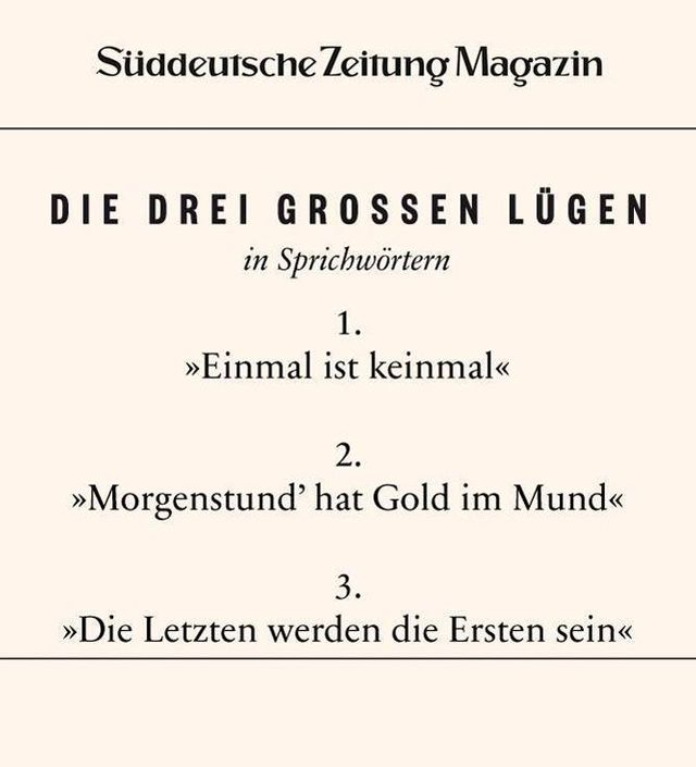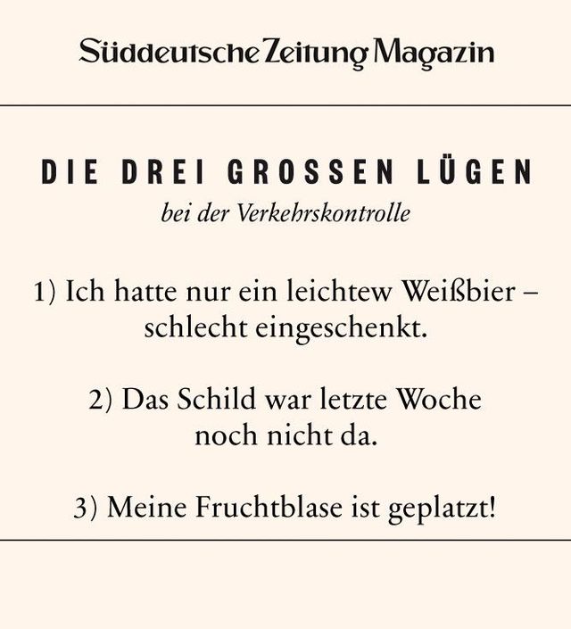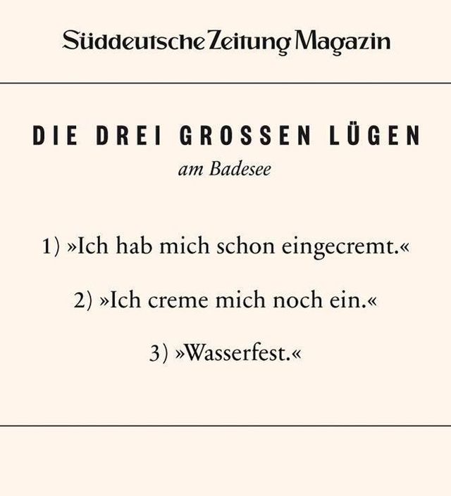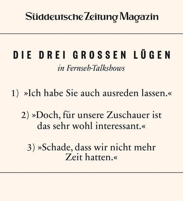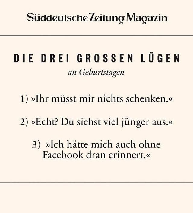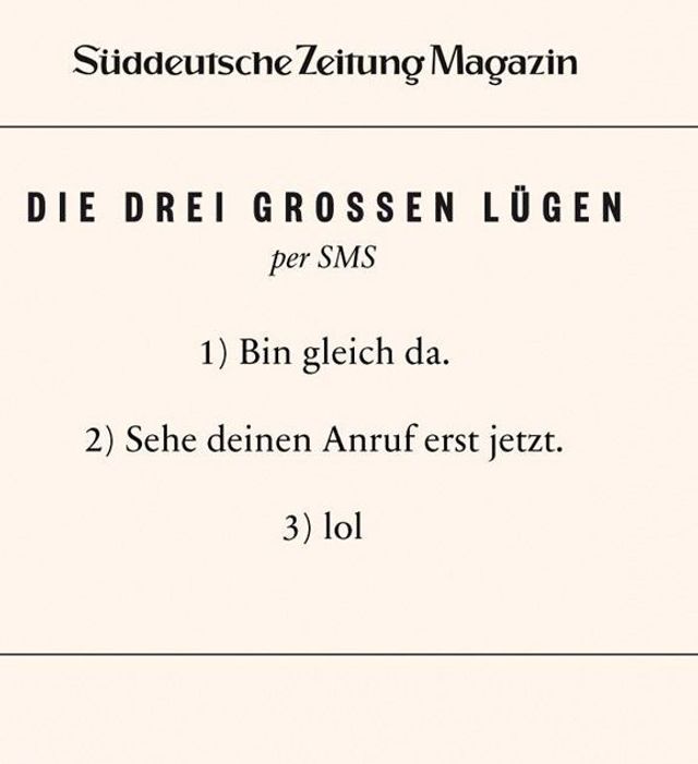 18. März 2016Die drei großen LügenDie drei großen Lügen – ArchivJeder Mensch lügt 200 Mal am Tag. Und die anderen fallen 200 Mal drauf rein. Das muss nicht sein: In dieser Rubrik sammeln wir die größten Lügen in allen Lebenslagen. Vorheriges Bild Nächstes Bild Die drei großen LügenStartseite > Themen > Die drei großen Lügen > Die drei großen Lügen – Archiv