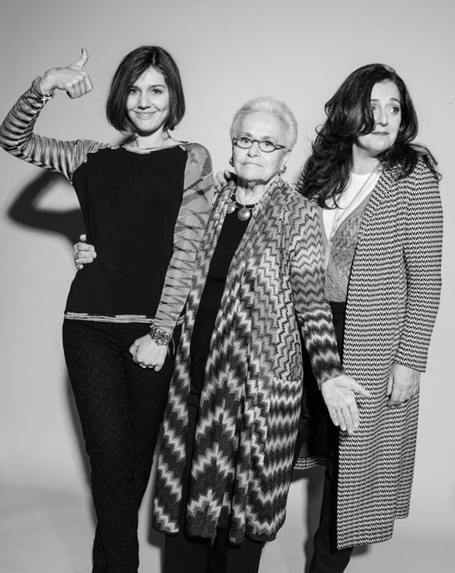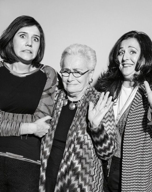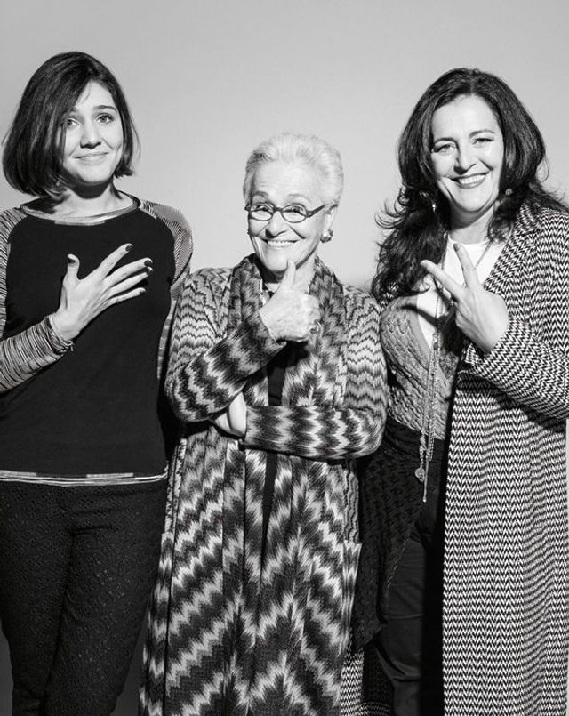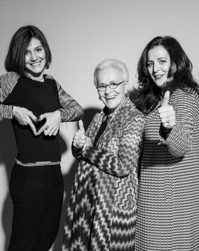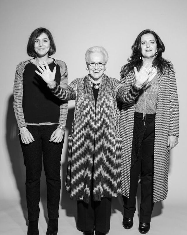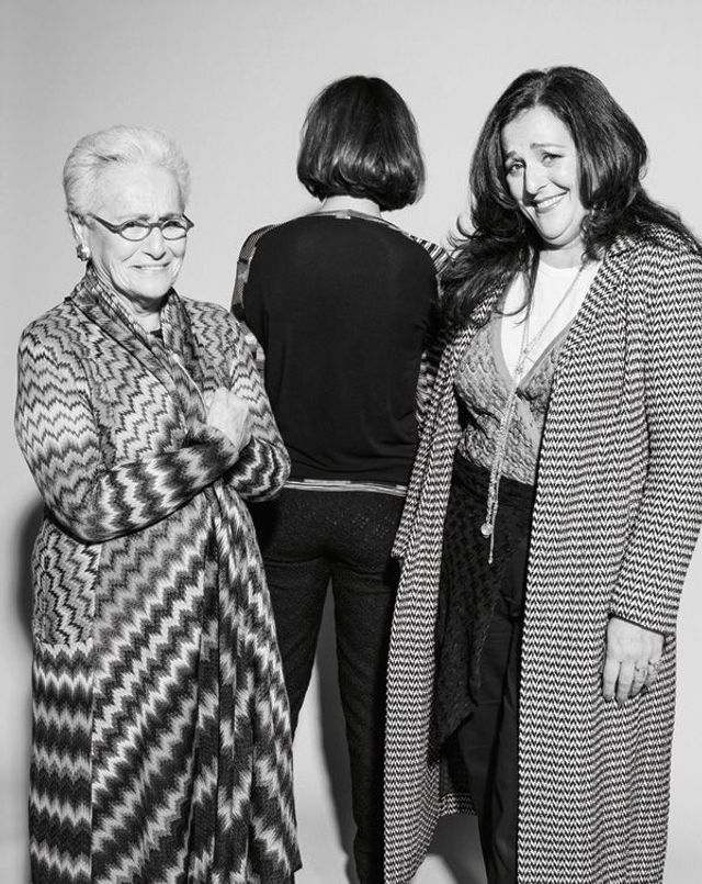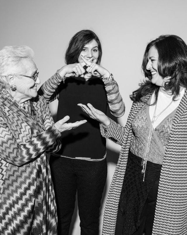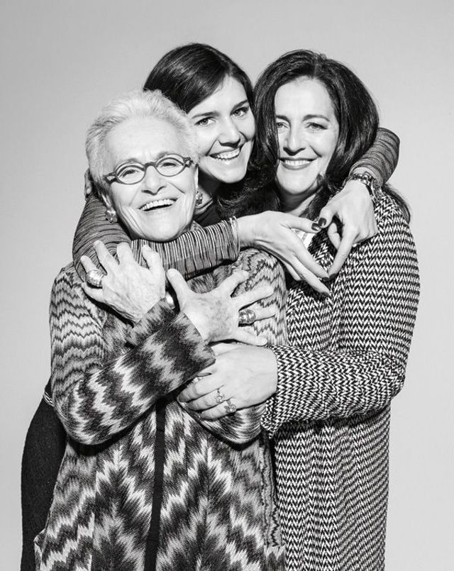 Als wir Oma, Mama und Tochter Missoni im Dezember 2012 auf der Berliner Designkonferenz »Monoqi« fotografierten, war die Stimmung ausgelassen und der italienische Familienclan noch komplett. Im Januar verschwand dann die kleine Propellermaschine von Vittorio Missoni, Rositas ältestem Sohn, auf dem Weg nach Caracas im Nichts. Noch immer gilt er als vermisst. Rosita, Tochter eines Tuchfabrikanten, ist die Mitbegründerin des Modeunternehmens: 1948 lernte sie den inzwischen 92-jährigen Ottavio Missoni bei den Olympischen Spielen in London kennen; fünf Jahre später fing das Paar mit zwei Strickmaschinen an. Bis heute ist das Zick-Zack-Muster das Erkennungszeichen der Firma, und Frauen auf der ganzen Welt wissen: Ein Strick-Bikini von Missoni ist vielleicht nicht praktisch, aber hübsch. Worauf die drei Frauen besonders stolz sind? »Vincoli familiari« (Familienbande) – die Marke ist noch immer zu hundert Prozent in Händen der Missonis.