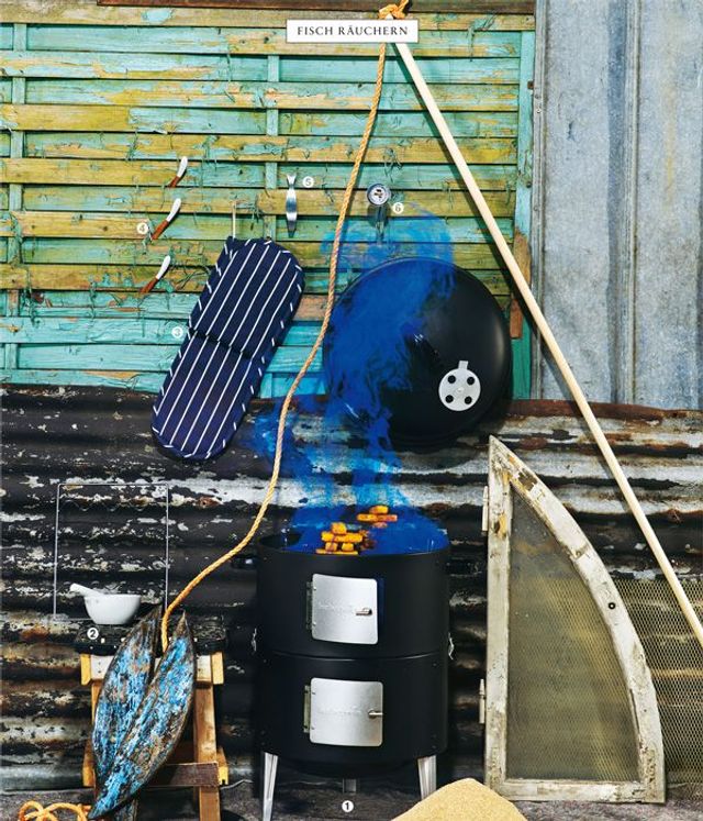1. Räucherchips in kaltem Wasser einweichen. Wacholder und Pfeffer im Mörser zerstoßen. Thymian waschen und trocken schütteln. Gewürze und Kräuter mit Zucker, und 1,5 l Wasser aufkochen, wieder abkühlen lassen. Die Fische waschen und in einer möglichst engen Schüssel mit der Pökel-Lake übergießen. 12 Stunden im Kühlschrank beizen, dabei mit Folie zudecken.