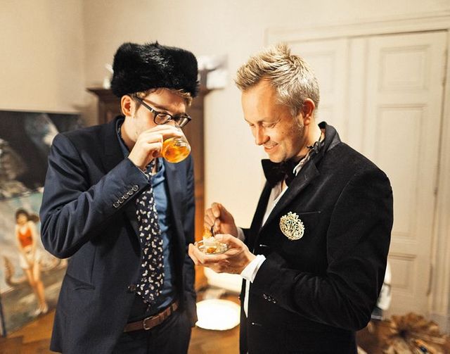 Es ist einer dieser Berliner Abende. Eine geräumige Altbauwohnung in Mitte, zwanzig Menschen, die beruflich alle etwas Vages machen und einander nach zehn, 15 Minuten gut genug kennen, um auch privatere Geschichten zu erzählen. Drei Hunde wuseln übers Parkett, Bernadette und Jana vom Salon »Sir Iwan« haben eine Tasche voller Accessoires mitgebracht, weswegen manche Herren jetzt imposante Fantasieorden und alle irgendeinen seltsamen Hut tragen, Busfahrerkappen, flotte Matrosenmützen, einen Zylinder. An der Wand hängt ein Bild, auf dem eine Bande von Männern mit Footballhelmen und mittelschwerer Bewaffnung eine Party in einer Altbauwohnung gestürmt hat. Ein Barkeeper mischt Cocktails, in denen schwere Kugeln aus geräuchertem Eis schwimmen, »Tamarindennektar«, sagt er und »Schokoladenbrand und Whiskeyessenz«, aber auch, dass er ganz sicher nicht verraten wird, wie man Eiskugeln räuchert. Um einen Stehaschenbecher sitzen drei Frauen und amüsieren sich über die Personalakquise von Berliner Galeristen, Tobias erzählt von der Valise Society, Visitenkarten, Telefonnummern, Websites, Einladungen, Versprechen werden getauscht, Lachen wandert durch den Raum, genau so könnte es jetzt ewig weitergehen, die Ideen, Projekte, Pläne fliegen, anderntags wird man sich großartig fühlen, wie immer, wenn einem die Gedanken gelockert werden und das Denken stimuliert.