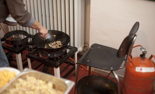 Wir haben einen großen Campingkocher mit Gasflaschen für unseren Wok gekauft und im Keller des Hauses der Kunst gekocht. Das Gemüse ist frisch auf deutschen Märkten, doch chinesischen Mangold und auch einige andere Zutaten fanden wir nicht. Szechuanpfeffer und die wichtigsten Gewürzmischungen haben wir mitgebracht. Wir kochen dreimal am Tag. Suppe gibt es am Morgen, Schweinefleisch und Huhn zu Mittag. Deutsche mögen Fleisch, Chinesen mögen Haut und Knorpel.