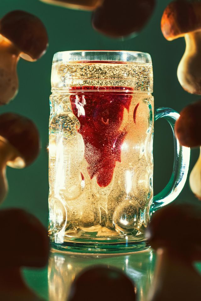 Im Märchen würde jetzt selbstverständlich die Steinpilzfee erscheinen. Ein rundliches Fabelwesen aus der nahegelegenen Häuser- und Kneipenansammlung Darmstadts, sie würde einen braunen Hut tragen zu einem weichen Bauch, kurzen Beinen und bernsteinfarbenen Flügeln, und sie hätte ein Laternchen dabei. Ein Laternchen ist ein Maßkrug voll süßgespritztem Apfelwein, in dem ein Sektglas mit Kirschlikör versenkt wurde. Ein Getränk, aus sich selbst heraus leuchtend, denn so was kann nur in einem dunklen Wald erfunden worden sein. Oder vielleicht in Darmstadt.