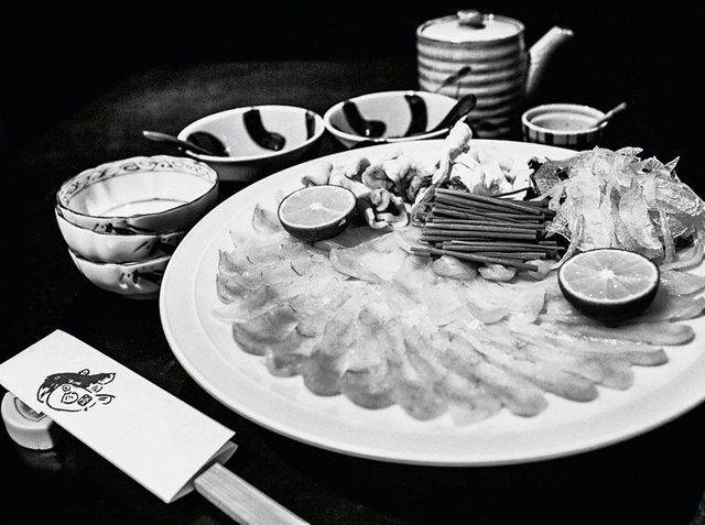 Fugu ist eine der teuersten Delikatessen, die man im ohnehin teuren Japan essen kann. Yasuge serviert ausschließlich Fugu (und Schildkröte, aber nur auf Nachfrage). Sein Standardmenü beginnt mit Sashimi, hauchdünn geschnittenen Scheiben vom rohen Fugu-Filet, die er kunstvoll auf einem Teller drapiert, sodass sie wie eine Chrysanthemenblüte wirken. Die Konsistenz des Fisches ist angenehm fest im Mund. Der Geschmack: unaufdringlich, eher fleischig als fischig – man kann sich darüber wundern, warum hier alle so begeistert davon sind. Vor allem sticht die fruchtige, herzhafte Sauce hervor, in die man das Sashimi dippt: Ponzu, eine Mischung aus Sojasauce und Zitrussaft; Yasuge schwört auf eine asiatische Bitterorange, genannt Daidai. Zum Sashimi wird auch die gekochte Haut des Fugus gereicht. Manche Stücke sind so weich, dass sie im Mund zergehen, andere elastisch wie Gummi. »Die Haut enthält viel Kollagen«, sagt Yasuge, das schätzten vor allem die Frauen, es lasse sie jünger aussehen.