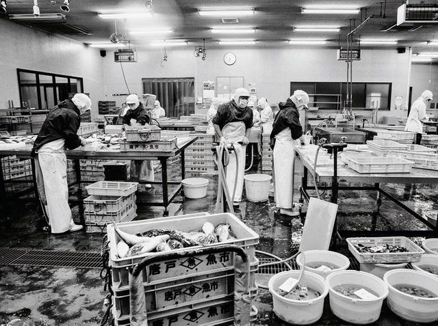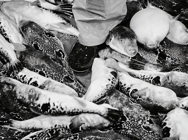 Auf dem Haedomari-Markt in Shimonoseki beginnt morgens um 3:20 Uhr die Fischauktion und damit die Fugu-Wertschöpfung. Etwa achtzig Prozent des wild gefangenen Kugelfischs, der in Japan auf den Tellern landet, wird hier gehandelt, rund 120 Tonnen im Jahr, vor allem Takifugu rubripes. Ausschließlich Männer, die Gummistiefel tragen, stehen an diesem Samstag in einer zugigen Halle und begutachten die frische Ware. Die Kugelfische leben noch. Sie wurden mit Langleinen vor der japanischen Küste gefangen, auf den Booten in Wassertanks gelagert und mit Tanklastern hierher gefahren. Nun zappeln sie in blauen Plastikkisten an der Luft, etwa zwanzig Fugus pro Kiste. Manche blähen sich vor Schreck zu Ballons auf, ihre Bäuche strahlen weiß, ihre Rücken sind graugrün gefärbt und schwarz befleckt.