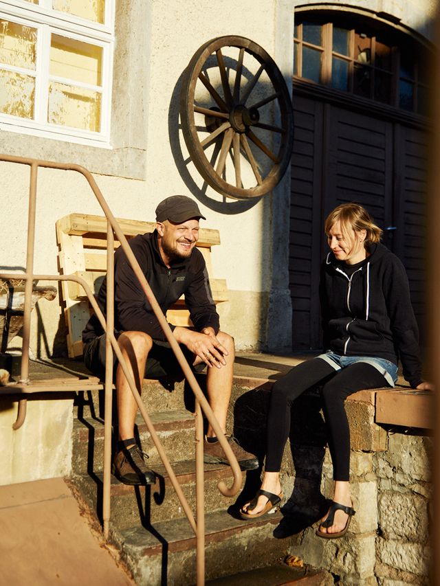 Einer der Stars dieser Szene, dessen Weine in Stockholm, New York und Tokio gehandelt werden und immer schnell ausverkauft sind, ist Michael Völker.Zusammen mit seiner Frau Melanie Drese betreibt er das Naturweinlabel 2Naturkinder (in den USA, wo ihr Wein besonders gut ankommt, wird ihr Label two nature kinder ausgesprochen). An diesem klaren, herbstlich kühlen Abend im frühen September ist Völker aufgeregt. Am nächsten Tag beginnen die vier wichtigsten Wochen des Jahres: die Lese. Er saugt an seiner Pfeife, dass es zischt. »Mit der Pfeife fing ich an, weil ich eigentlich weniger rauchen wollte«, sagt er und lacht: Dann kam er nämlich drauf, dass er Pfeife rauchen kann und trotzdem beide Hände zur Arbeit im Weinberg frei hat. Das war es dann mit dem guten Vorsatz. Der 38-Jährige sitzt im Innenhof einer Kellerei am Rande der alten Weinbau- und Weinhandelsstadt Kitzingen. Schwalben schlagen enge Kurven auf der Jagd nach den letzten Mücken, in den alten Mauern wohnen auch Fledermäuse. 1843 gründete ein Ahn von Michael Völker die Kellerei, die Anlage sieht aus, als hätte ein Riese Tetris gespielt: unzählige ineinander verschachtelte Gebäude, darin Stufen und Ecken, wo man keine erwartet.