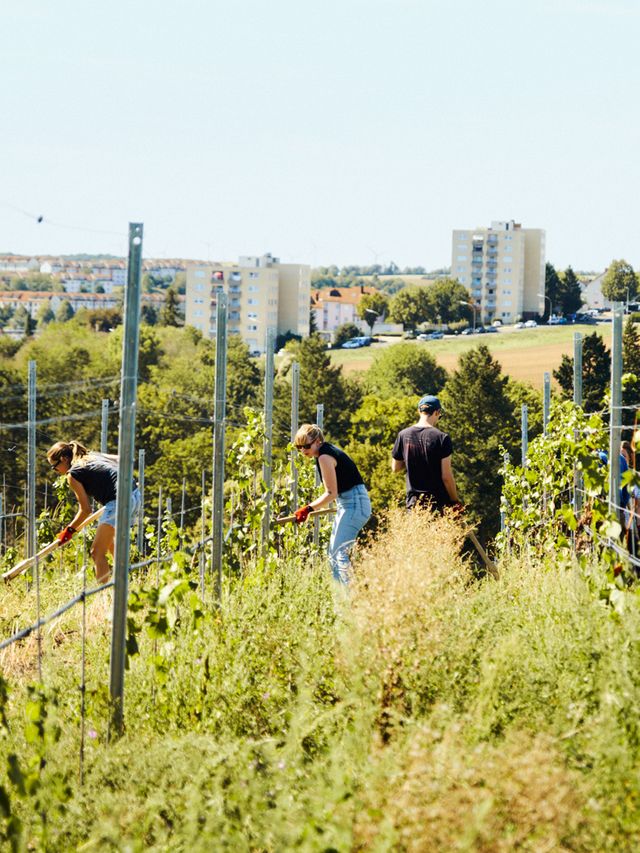 Für die Zeit der Lese beherbergen die 2Naturkinder bis zu sieben Hospitantinnen und Hospitanten auf ihrem Gut. Die packen mit an und lernen, Wein zu machen – und zwar so wie vor 200 oder 2000 Jahren. Viele würden über Instagram auf sie aufmerksam, sagt Völker. Sie könnten immer nur einen Teil aufnehmen. Und so sitzen nun am Tisch: zwei US-Amerikanerinnen, ein Australier, zwei Russinnen, ein Österreicher und ein Kanadier, alle zwischen 20 und 30. Aus der Boombox kommt der raue Siebziger-Prä-Punk-Sound der New York Dolls. Die Welt der Butzenscheiben, Weinköniginnen und Römergläser könnte kaum weiter entfernt sein.
