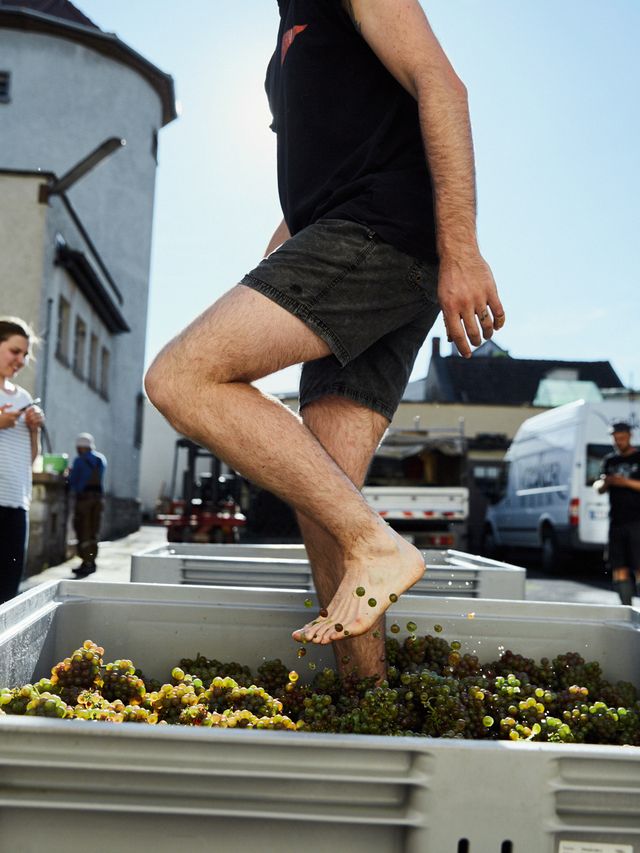 Die Sonne verschwindet hinter sanften Hügeln, der Tag war ideal für die Lese. Warm, aber nicht zu warm, und vor allem trocken. Nun geht die Arbeit erst richtig los. Die Trauben ruhen in einem großen Bottich, sie sollen jetzt gestampft werden. Die Hospitanten zieren sich. Mit nackten Füßen ein Lebensmittel zu treten, ist eine intime Angelegenheit. Doch Völker ermuntert sie: »Und passt auf die Wespen auf!« Bald verlieren sie die Scham und stampfen wie wild, Der trübe Perlwein aus dem Vorjahr, den Völker extra für die Ente zurückgelegt hat, hilft nach. Grüne Brühe quillt zwischen Zehen hervor. Naturwein muss nicht mit den Füßen gestampft werden, man könnte die Trauben auch mechanisch matschen, um sie anschließend in die alte Korbpresse zu füllen. Aber so wurde eben über Jahrhunderte hinweg gearbeitet.