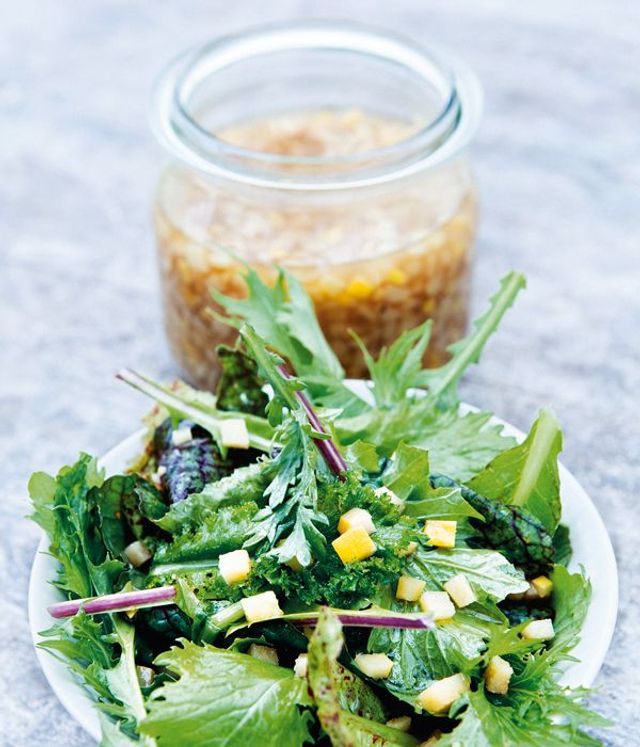 Durch ihren süß-sauren Charakter eignen sich eingelegte Quitten als Beilage zu Ente, Schwein und fettreichem Fisch sowie als Zugabe zu Reis- und Nudelgerichten. Rund um die Quittenwürfel gibt es reichlich Flüssigkeit - und das mit voller Absicht. Ergänzt um einen Schuss natives Olivenöl extra lässt die sich nämlich in eine wundervolle Vinaigrette verwandeln - für asiatischen Senfkohl wie für alle bitteren Salat- und Grünkohlsorten, die im Winter Saison haben: Zichoriensalat, Endivie, Schwarzkohl und Roter Krauskohl.
