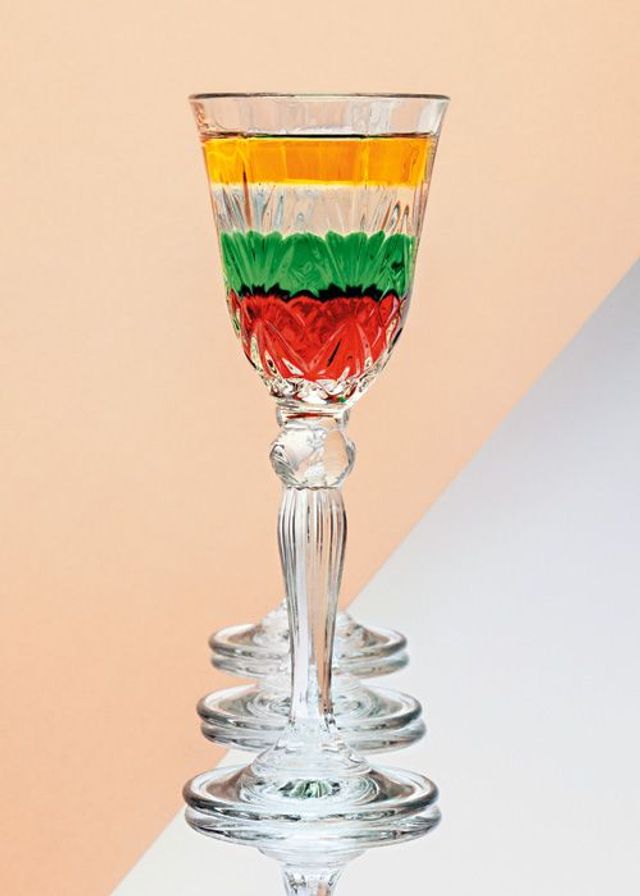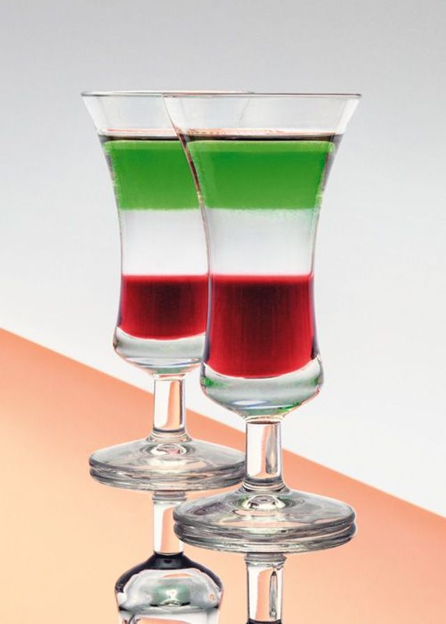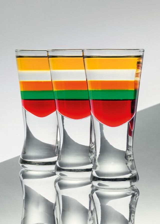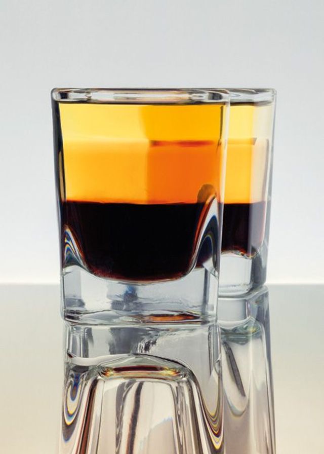 Die Bastler unter den Mixologen amüsieren sich derzeit mit der Wiederbelebung der Pousse-cafés, auch Layers oder Schichtcocktails genannt. Diese Parade-Digestifs der Nierentisch-Ära erfordern einiges an Geschicklichkeit, vor allem aber das Wissen um die spezifischen Gewichte diverser Spirituosen, Sirups und Liköre, die vorsichtig über einen Löffelrücken ins Glas gegossen werden. Geduldige Tüftler schaffen sechs, sieben Schichten und versenken sogar noch ein Eigelb im Glas. Beim »Knickebein« etwa, dem wohl ältesten Rezept dieser Gattung, das sich im 19. Jahrhundert in Jenaer Studentenkreisen großen Zuspruchs erfreute, wird das Eigelb auf einer Schicht Kirschlikör platziert, gefolgt von Vanillelikör und Cognac – ein dekonstruierter Eierlikör quasi, aromatisch durchaus stimmig, ganz im Gegensatz zu jenen Pousse-cafés, die in den USA der Prä-Prohibitionszeit und dann wieder im Nachkriegsdeutschland Furore machten. Doch auch bei der neuen Generation geht es weniger um Geschmackserlebnisse als um den optischen Reiz – oder glaubt jemand, dass ein »Baseball« aus Himbeergeist, Crème de Cassis, rotem Curaçao, gelbem und grünem Chartreuse, Veilchenlikör, Kümmel und Cognac etwas anderes verspricht als Kopfschmerzen? Wer zu viel davon erwischt, gönnt sich einen »Thunderbolt«, der alles enthält, was gegen Kater helfen soll: grüne Crème de Menthe, Eigelb, Cayennepfeffer, Cognac und Worchestershiresauce – ex und hopp.