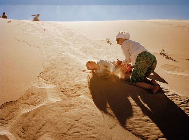 Die Wüste Gobi ist riesig. Die Sanddünen begeistern uns. Berge aus weißem Sand vor einem stahlblauen Himmel. Das ist ein Moment, in dem wir alle glücklich sind.
