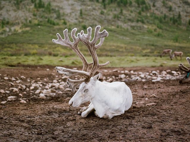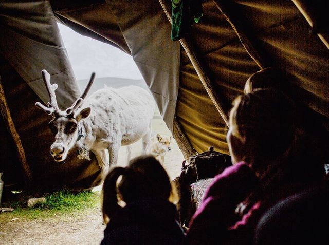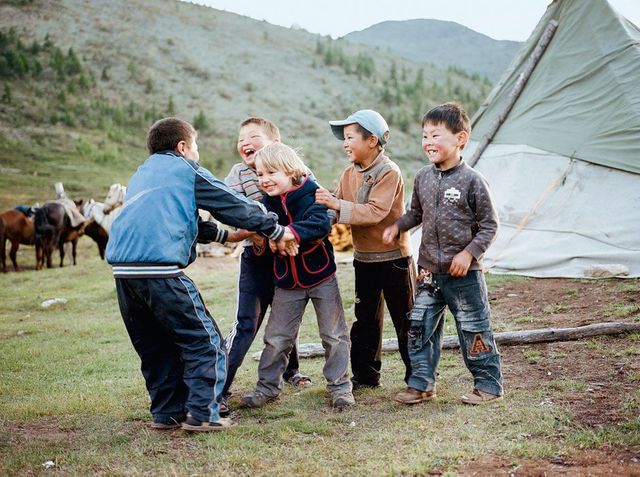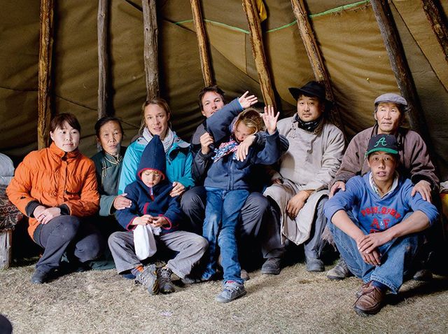 Und dann, noch während unserer Rutschpartie durch den Schlamm, werden am Horizont zahlreiche weiße Tipis sichtbar: die Nomaden. Genau im richtigen Moment. Nach dem achtstündigen Ritt können wir uns kaum noch auf den Beinen halten. Am nächsten Tag freundet sich Kasimir schnell mit den Kindern an und wird schon nach kurzer Zeit huckepack weggetragen. Zusammen mit den mongolischen Mädchen und Jungen spielt er Uno – das Kartenspiel haben die mongolischen Kinder bei sich – und tobt mit den Hunden. Wir sitzen vor dem Zelt, warten auf die schamanische Zeremonie und trinken heißen, salzigen Tee mit Rentiermilch, essen Sauerteigbrot und getrockneten Rentierquark. Mit Lotte, aber ohne Rollstuhl.