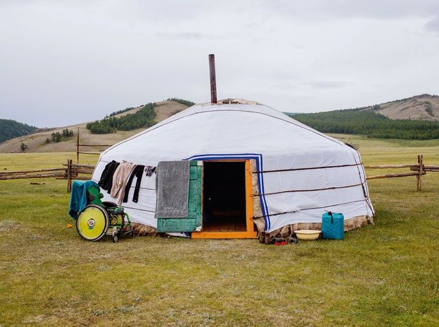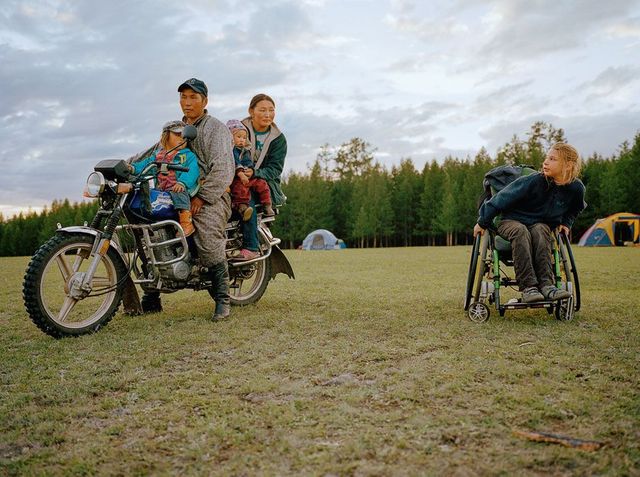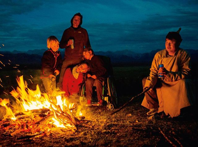 An das tägliche Auf- und Abbauen der Zelte haben wir uns mittlerweile gewöhnt. Wir wissen, wer nach den langen Autofahrten welche Aufgaben zu erledigen hat. Je mehr wir Lotte in diese Arbeiten integrieren, desto friedlicher wird sie. Wir packen ihr die Schlafsäcke und Isomatten auf den Schoß, die sie einzeln mit ihrem Rollstuhl zu unserem Schlafplatz transportiert. Sie will schwere Äste festhalten und zur Feuerstelle bringen. Beim Holzhacken sitzt sie begeistert daneben und lacht über die Bewegungen und Geräusche. Selbst das Waschen im kalten Wasser des Sharga-Sees toleriert Lotte. Das archaische Leben in der Mongolei gefällt ihr. Es scheint sie auch nicht zu stören, wenn sich in den Ortschaften eine Traube von Menschen um ihren Rollstuhl bildet. Lotte wird hemmungslos angestarrt. Sie ist eine Attraktion. Ich verstehe, warum. Auf unserer Reise sehen wir nicht einen einzigen Menschen mit Behinderung. Immer wieder begegnen uns ganze Familien auf einem Moped, die schaulustig neben Lottes Rollstuhl stehen bleiben, sie intensiv anschauen und ohne ein Wort zu sagen weiterfahren.