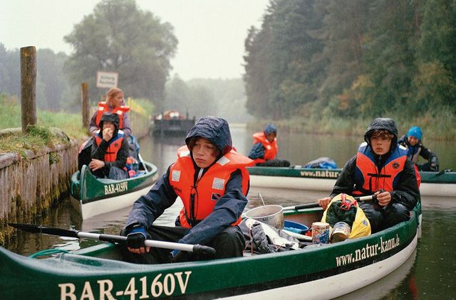 Ganz zum Ende wird das Wetter wieder besser. Die Kinder haben Spaß, als sie sich von einem Seil, das sich über einen Fluss spannt, ins Wasser stürzen. Sie schreiben eine Flaschenpost, in der sie ihre Reise mit Zeichnungen beschreiben und ihre Namen und den der Schule daruntersetzen. Einmal schläft Bruno auf dem Kanu ein. Bis er wieder aufwacht, paddeln die anderen im Boot ein ganzes Stück für ihn mit, durch Seerosen hindurch. Und in Hammelspring bei Templin fallen sie auf wie Zirkuskinder, als sie Brötchen holen: Barfuß laufen sie in den Supermarkt, ihre Trainingshosen hängen tief, weil auch der Dreck inzwischen einiges wiegt.