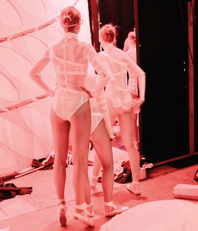 Der Probenalltag ist ernüchternd: Das Ballett, heute 15 Frauen, vier Männer, zur Hälfte Deutsche, die anderen aus Ländern wie der Ukraine, Uganda, Österreich, bereitet sich in einer Halle vor, so groß, dass darin Autos herumfahren, hüfthohe Quader mit in Plastik eingewickelten Decken stehen im Dutzend herum, provisorische Stellwände markieren die Garderoben, es gibt Joghurt zu essen und weiche Semmelhälften mit Mandarinenscheibe auf der Wurst. Ein Tänzer übt Flickflack, ein anderer dreht seine Hüften, Tänzerinnen dehnen sich im Stehen, im Sitzen, im Liegen mit iPod, ohne, oder sie telefonieren – im Spagat. Kurz vor 19 Uhr geht es Richtung Bühne, fast alle tragen ihre Zweit- und Drittkostüme über dem Arm, viele müssen sich zweimal während der Show umziehen, fliegender Wechsel. Tanzen, lächeln, abgehen, 30 Sekunden ab jetzt: langes Kleid aus, rotes Discodress an, Lockenperücke drauf, die Siebzigerjahre sind fertig angezogen, raus, lächeln, lächeln, tanzen. Dann Finale der Zeitreise mit den zehn Futuregirls, zack, zack, und ihren Taucherbrillen. Der Applaus des Publikums ist berauschend lang und laut. Die »Future« hat heute besser geklappt, signalisiert die Choreografin nach dem Auftritt.