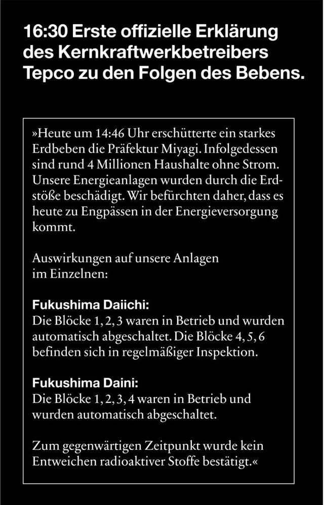 Dann begann eine neue Zeitrechnung. Vor der Küste ereignete sich das stärkste Erdbeben seit Beginn der japanischen Aufzeichnungen. Es löste einen Tsunami aus, der mit Wellen von bis zu zwanzig Meter Höhe auf die Küste traf und ganze Städte ausradierte. In den Atomkraftwerken von Fukushima kam es zu Explosionen, in der Folge entwichen große Mengen radioaktiver Strahlung aus den zerstörten Reaktoren.