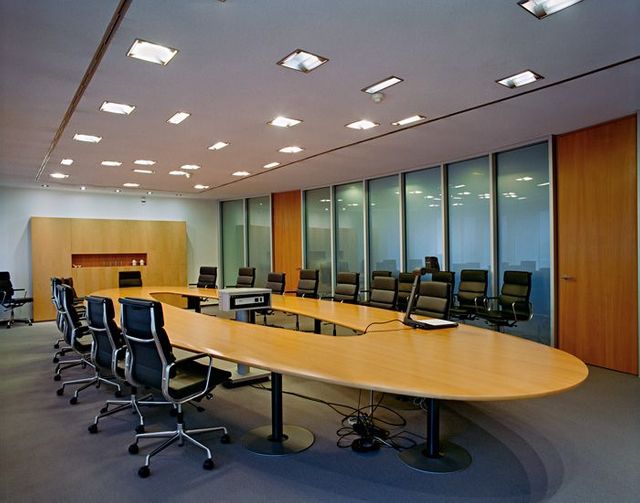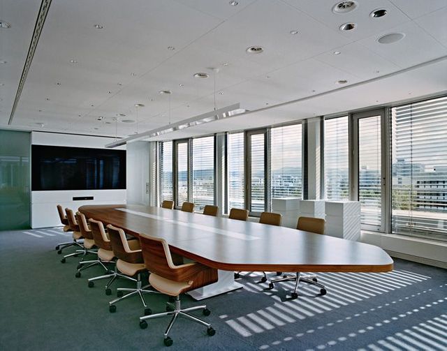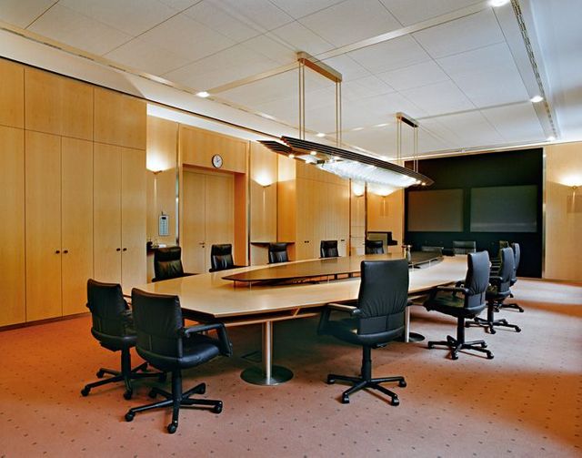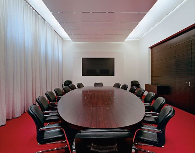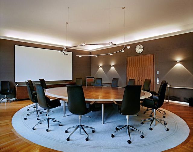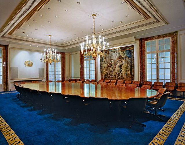 Bei Royal Dutch Shell, dem umsatzstärksten Mineralölkonzern der Welt, hängen zum Beispiel die Porträts ehemaliger Vorstandschefs an der Wand, die Stühle sind gemäß dem weltweit bekannten Firmenlogo mit rotem Leder überzogen, nur ein Stuhl ist gelb, der des amtierenden CEOs Peter Voser. Aber es geht auch etwas pompöser: Der Vorstand der französischen Bank BNP Paribas konferiert in jenem Raum, in dem Napoleon Bonaparte im Jahr 1796 Joséphine de Beauharnais heiratete; an der Wand ein Teppich mit dem Titel Die Ermordung Julius Caesars, 44 v. Chr. Die schweren Kronleuchter verschwinden per Knopfdruck in der Decke, wenn eine Projektionsleinwand herunterfährt. »Dazu bilden die Konferenzräume der führenden deutschen Unternehmen einen Kontrast«, sagt Hassink. Bestes Beispiel: ThyssenKrupp. Ein rechteckiger dunkelbrauner Holztisch auf breiten Stahlstützen, acht mit schwarzem Leder überzogene Stühle und der Blick durch viel Glas auf das Stammhaus der Krupps. »Minimalistisch, aber sehr modern«, sagt Hassink, »die Deutschen mögen es eben bescheidener.«