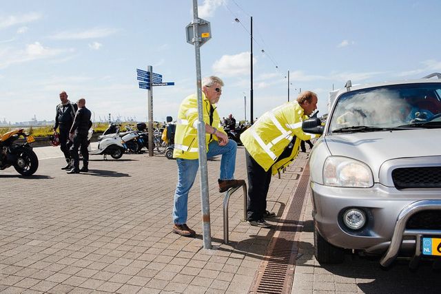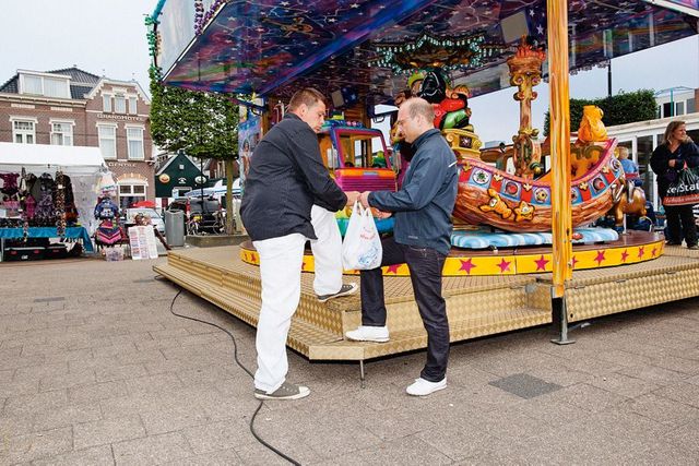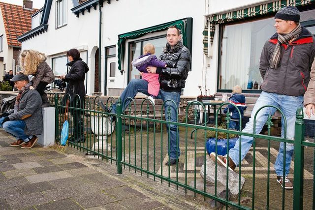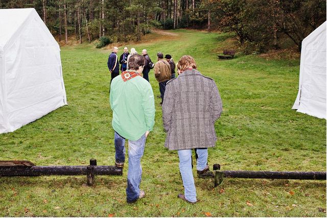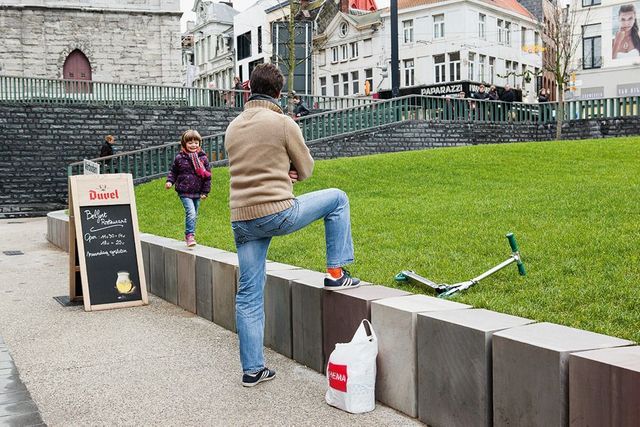 Das Telefonat vor dem Pub, der Blick auf den nächtlichen Hafen, die Pause beim Kirmesbesuch: Wir sehen Männer in einem Moment der Ruhe, des Innehaltens im öffentlichen Raum. Der Fuß, lässig auf einem Podest ruhend, signalisiert entspannte Erhabenheit. Wer das Spielbein wie nebenbei und offenbar zweckfrei auf Kniehöhe abstellt, dazu womöglich noch die Hand in eine Tasche steckt, der hat weder die Absicht zu fliehen noch zu kämpfen: Er wählt die Pose siegreicher Großwildjäger. Ob der Fuß nun auf einem erlegten Nilpferd ruht oder, wie hier, einem Kinderkarussell - der Mann steht ganz im Einklang mit seiner Welt. Gut möglich, dass die zwei Herren auf der regennassen Wiese über die Natur sinnieren, die vor ihnen liegt - ganz wie Caspar David Friedrichs Wanderer über dem Nebelmeer. Doch wo immer der Mann einen Fuß auf etwas stellt - und sei es ein Zaun oder der Rollstuhl der eigenen Mutter - reklamiert er die Vorherrschaft. Was für Christoph Kolumbus der Strand Amerikas war, ist also für den Mann mit Leuchtjacke der Eisenpoller auf dem Parkplatz: die Welt als Untertan des Mannes. Die Symbolik ist klar. Wer mit einem Fuß auf dem Sockel steht, kann im nächsten Moment ganz hinaufsteigen und dort wie ein moderner David zur anbetungswürdigen Statue werden. Vorausgesetzt, er setzt vorher die Tochter auf dem Boden ab.