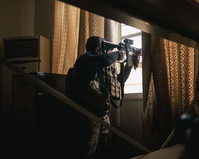 Mehrere Bilder sind beim Sturm auf die Universität ganz nah an der Frontlinie entstanden, zum Beispiel das eines Mannes, der mit einem Maschinengewehr aus einem Fenster feuert (Anmerkung: Bild 20). Wenn ich aus dem Fenster geblickt hätte, hätte ich die IS-Kämpfer sehen können, auf die er feuert, dafür war es aber zu gefährlich. Ich habe aber ihre »Allahu akbar«-Rufe gehört.