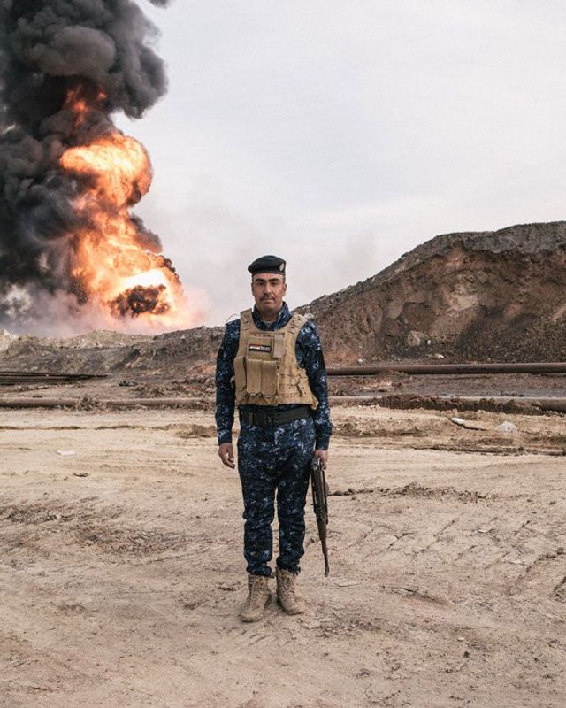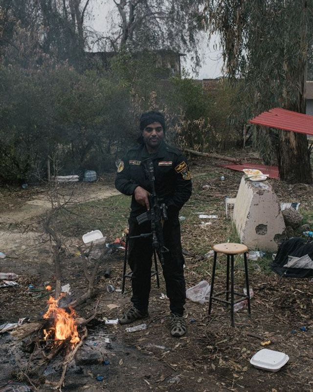 Ja, es war die ganze Zeit ein Höllenlärm, alle haben rumgefeuert. Dieses Bild, wo man Rauch aufsteigen sieht (Bild 15) - der kommt von einem Luftschlag der Amerikaner gegen den IS. Auf den ersten Blick wirkt vieles, was die irakische Armee macht, ziemlich improvisiert, das Bild eines Mannes, der an einer Feuerstelle steht, entstand zum Beispiel auch ganz nah an der Front (Bild 18). Am Ende sind die aber doch sehr gut aufgestellt und kommunizieren mit ihrem Supercomputer mit den Geheimdiensten und dem Luftkommando der Amerikaner. Am Himmel über Mossul waren auch ständig Aufklärungsflugzeuge und Drohnen zu sehen.