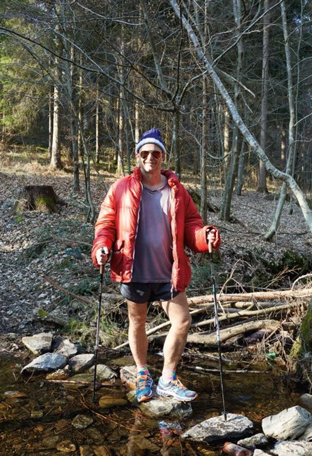 Ein Foto aus der Kurklinik zeigt Sie in kurzer Hose und mit Pudelmütze beim Nordic Walking. Hipster senken bei dieser Disziplin den Daumen.