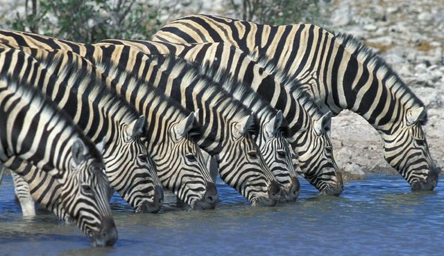 Diese Aufnahme liegt lange zurück. Ich war damals im Etosha-Nationalpark in Namibia. In der Trockenzeit kommen hier regelmäßig viele Wildtiere an die Wasserstellen. Am späten Vormittag sieht man dort große Herden durstiger Giraffen, Antilopen und eben auch Zebras: an sich eine leichte Möglichkeit, zu guten Wildtieraufnahmen zu kommen. Wegen des hohen Sonnenstandes muss man jedoch leider meist mit hohen Kontrasten auf den Fotos rechnen. Das unterschiedliche Licht der Tageszeiten spielt bei der Naturfotografie eine entscheidende Rolle.