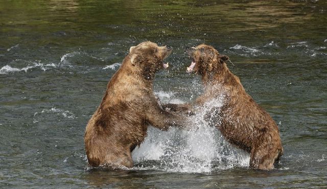 Diese Situation ergab sich vor einigen Jahren Mitte Juli ebenfalls am Brooks River. An jenem Tage zogen nur wenige Lachs stromaufwärts und die beiden alten Grizzlys waren lange Zeit erfolglos. Dann hatte einer der Bären einen Lachs gefangen. Drohend bewegte sich der andere auf ihn zu. Solche ebenbürtigen „alte Herren