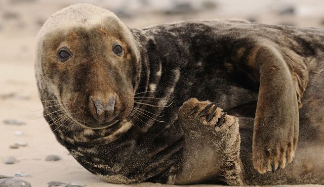 Diese Kegelrobbe habe ich im Februar vor zwei Jahren auf Helgoland fotografiert. Normalerweise sind Robben sehr scheu, aber auf der Nordseeinsel stehen sie unter besonderem Schutz und haben sich an die vielen Touristen gewöhnt. Daher konnte ich mich diesem Bullen bis auf wenige Meter nähern. Erst als ich nur noch ein paar Meter von ihm entfernt war, hob er seinen Kopf. Ich musste schmunzeln als ich seinen beinah menschlichen neugierigen Gesichtsausdruck durch den Sucher sah, als er mich bemerkte.