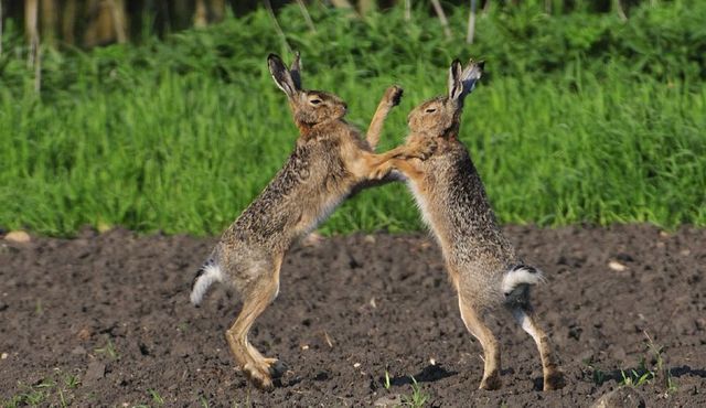Hier streiten sich Rammler und Häsin während der Paarungszeit. Die Hasenhochzeit ist ein interessantes Spektakel. Wenn die Häsin noch nicht paarungsbereit ist, bezieht der Rammler Prügel. So stellt sie sich auf die Hinterläufe und ohrfeigt den aufdringlichen Verehrer. Dabei geht es oft recht rau zu: so habe ich auch schon gesehen, wie eine Häsin den Rammler zu Boden wirft und auf ihm herumtrampelt.