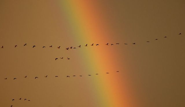 Alljährlich im Herbst machen die Kraniche auf ihrem Zug nach Süden Rast an der Ostsee. Die Vögel werden dort auch von Naturschützern auf den Maisfeldern gefüttert, damit sie gestärkt ihre Weiterreise antreten können. Die Ankunft der Kraniche ist ein großartiges Naturschauspiel. Als Naturfotograf muss man zur richtigen Zeit am richtigen Ort sein. Das ist oft nur per Zufall und mit viel Ausdauer möglich. In diesem Fall war es der Moment, als der Regenbogen aufkam und zu meinem Glück Kraniche am Himmel auftauchten.