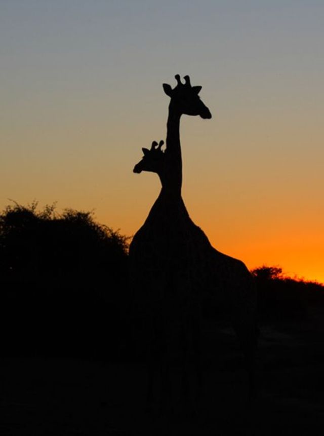 Bilder von Wildtieren im Sonnenuntergang sind in der Regel für jedermann eindrucksvoll. In Afrika stellen solche Momente zweifellos ein Highlight jeder Safari dar. Obwohl Sonnenuntergänge hier nicht selten sind, steht dem Fotografen nur wenig Zeit zur Verfügung. Zum Einbruch der Dunkelheit müssen Safarifahrzeuge nämlich in den meisten afrikanischen Nationalparks wieder im Camp sein und die Sonne geht am Äquator sehr schnell unter. Ich erinnere mich: Im Chobe Nationalpark hatten wir uns bei der Suche nach Elefanten verspätet und waren bei der Rückkehr zum Camp im Zeitdruck Dann tauchte eine Herde Giraffen auf. Es war nur noch die Silhouette der Tiere zu sehen, denn die Sonne war bereits untergegangen. Ich bat den Safarifahrer kurz anzuhalten und schoss in Eile ein paar Aufnahmen. Auf diese Weise entstand dann diese lustige Konstellation des „Doppelkopfes