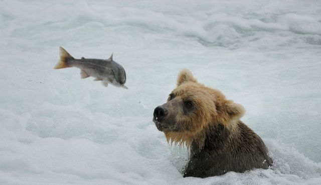Grizzlys in Alaska fotografiere ich bereits seit vielen Jahren. Bären beim Lachsfang zu beobachten, gehört für mich zu den unvergesslichen Erlebnissen. Im Sommer ziehen die Lachse zum Laichen den Brooks River stromaufwärts. An den Brooks Wasserfällen sammeln sich die Lachse und die Bären machen hier leichte Beute. Manchmal springen die Lachse bei der Überwindung der Fälle den dort wartenden Bären regelrecht ins Maul. Dieser Grizzly hatte offensichtlich Pech gehabt.