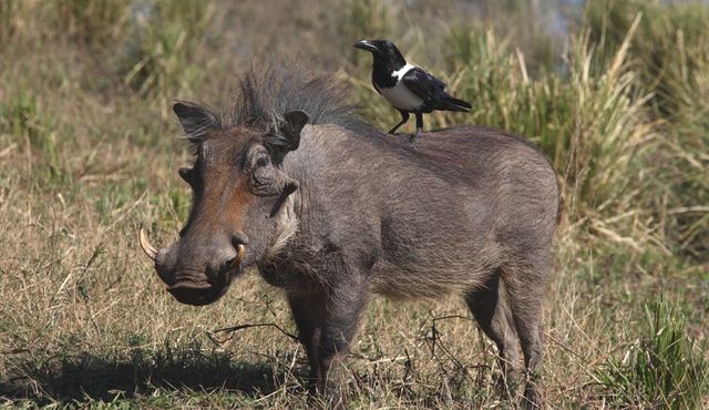 Nach einer morgendlichen Pirschfahrt im Chobe-Nationalpark kam ich am späten Vormittag zum Camp am Fluss zurück. Unweit von meinem Zelt sah ich einen Warzenschweinkeiler auf Nahrungssuche. Zu meinem Erstaunen bemerkte ich einen Schildraben, der sich auf dem Rücken des Schweins Nahrung suchte. Offensichtlich zum Wohlgefallen des Keilers. Ich machte auf kurze Entfernung eine Reihe von Aufnahmen. Diese gefällt mir am besten, weil Keiler und Rabe für einen kurzen Moment den Kopf heben.