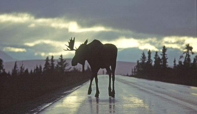 Das war eines meiner ersten Bilder, die ich in Alaska gemacht habe. Ich war auf der Suche nach Elchen im Denali-Nationalpark. Das muss 1984 gewesen sein. Plötzlich stand da dieser Elch, der in aller Ruhe die Straße überquerte. Ich weiß noch, dass es zuvor sehr stark geregnet hatte. Die dunklen Wolken und der nasse Boden vermitteln eine interessante Stimmung.