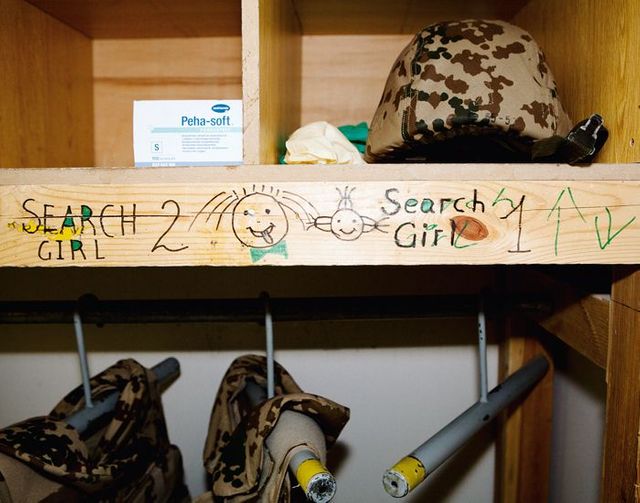 In ihrer zweiten Woche im Feldlager lernt Maren Schulz*(*Namen aller Soldatinnen im Einsatz geändert), was ein »Search Girl« machen muss. Sie stellt sich an eine Wand, und Hauptfeldwebel Nadine Luter erklärt ihr, wie sie Menschen nach Sprengstoff abtastet: »Mach vorher ein Codewort aus«, sagt sie. »Wenn du ein Kabel spürst, sag ›Erbsensuppe‹ – dann weiß deine Kameradin, hier ist was los.« Search Girls sind Soldatinnen, die an den Eingängen des Feldlagers afghanische Mitarbeiterinnen des Camps, Übersetzerinnen oder Putzhilfen, nach Waffen durchsuchen. Codeworte wie ›Erbsensuppe‹ sind üblich für den Fall, dass doch jemand Deutsch versteht. Würde Hauptfeldwebel Nadine Luter das Codewort hören, liefe alles ab wie im Film: Nicht bewegen! Hände hinter den Kopf!