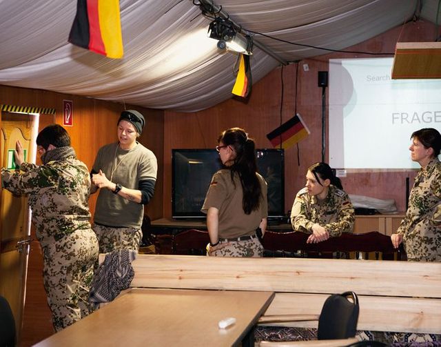 Dann ist Mittagessen, keine besonderen Vorkommnisse. In der deutschen Feldküche gibt es Gulasch, Knödel, Erbsen, Obstsalat mit Sprühsahne, eingeflogen aus Deutschland. Hunderte Soldaten essen an langen Tischen, einige haben ihre Maschinengewehre auf den Boden gelegt. Im Fernsehen läuft die Deutsche Welle, an der Wand hängt eine schwarz-rot-goldene Flagge. Alltag.