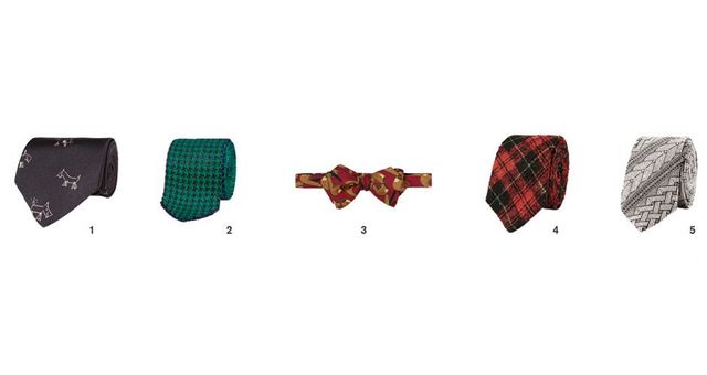 1 Seidenkrawatte von Paul Smith 2 Pepitakrawatte von Edsor Berlin 3 Fliege von Drake’s, ges. bei mrporter.com 4 Karokrawatte von Drake’s 5 Krawatte mit Zopfmuster-Print von Marwood, ges. bei mrporter.com