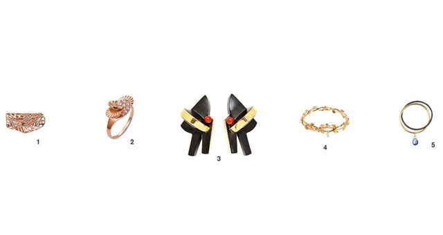 1 Armreif »Art Nouveau« von Repossi 2 Diamantring »Paris Nouvelle Vague« von Cartier 3 Ohrringe »Paloma« von Sophia Vari über galerieminimasterpiece.com 4 Armreif von Vieri by Bibi van der Velden 5 Filigraner Ring von Inez & Vinoodh, ges. bei colette.fr