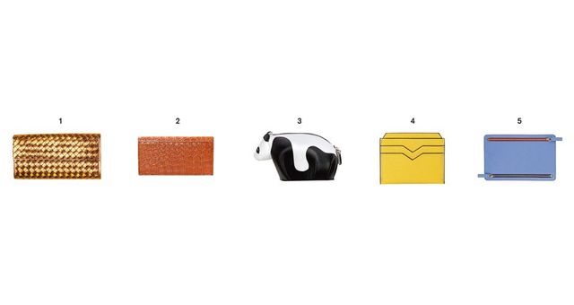 1 Goldenes Portemonnaie von Bottega Veneta 2 Herrenbrieftasche von John Lobb 3 Panda-Geldbeutel von Loewe 4 Kreditkartenetui von Valextra, ges. bei mrporter.com 5 Geldbörse von Smythson, ges. bei colette.fr