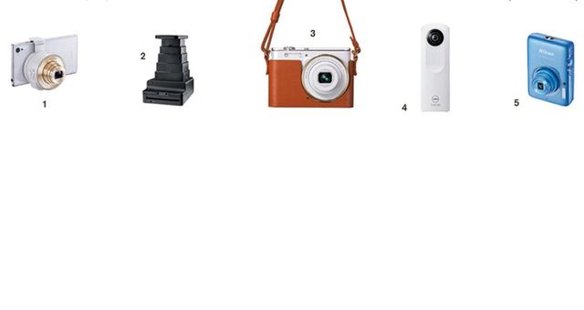 1 Cybershot-Kamera zum Erweitern der Smartphones von Sony 2 »Instant Lab« von Impossible wandelt digitale Bilder in analoge Sofortbilder um 3 Vintage-Design: Casio Exilim EX-JE10 4 360-Grad-Kamera von Ricoh 5 Kompaktkamera Coolpix S02 von Nikon