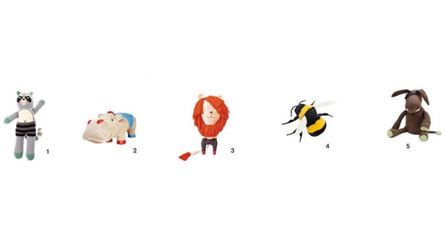 1 Strickwaschbär von Blabla, ges. bei colette.fr 2 Vintage-Nilpferd von Renate Müller 3 Löwe »Mr. Lion Heart« von jipijipi. etsy.com 4 Plüschhummel von Kösen 5 Stofftier »Piet« von Stofer und Hartjen