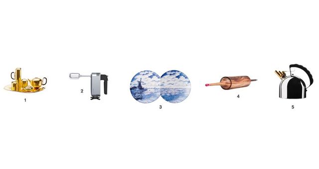 1 Teeservice von Tom Dixon 2 Handrührgerät von Turmix 3 Servierplatte von Maxime Ansiau 4 Nudelholz von Tahir Mahmood 5 Wasserkocher von Alessi