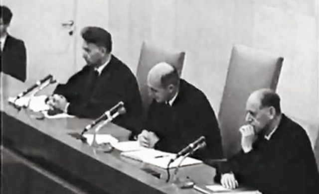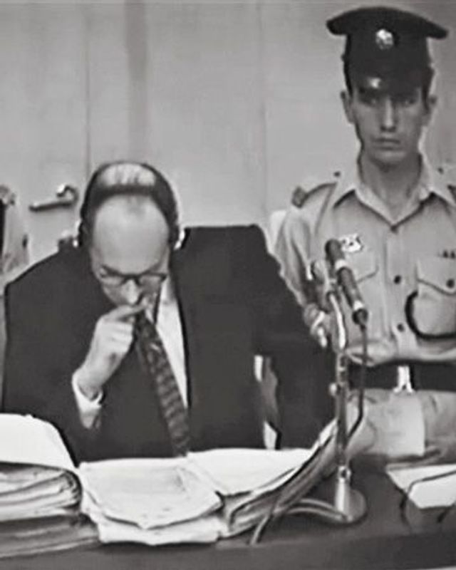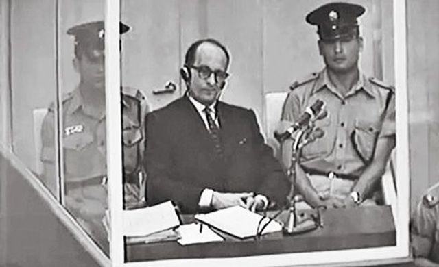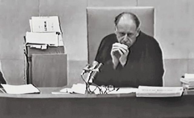 Eichmann sitzt in seinem Glaskäfig und hört zu.