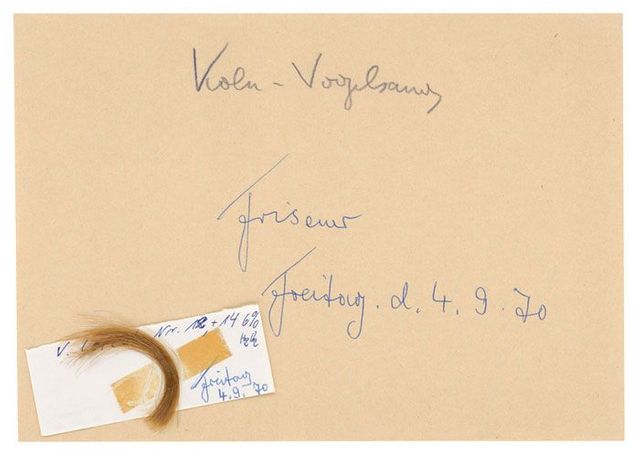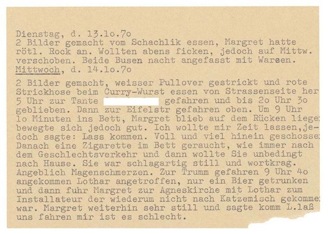 Darin lagert eine Passion. Sie lagert in blauen Firmenkuverts, Günters geheimes Tagebuch. In den Umschlägen stecken Karten, darauf hat Günter mit Datum und Uhrzeit notiert, was er mit Margret getrunken und gegessen hat, wo sie Sex hatten, ob Margret das »gelbe Kleid mit lila Borde« oder das »grüne Wildlederröckchen« trägt. Im Koffer liegen auch Antibabypillen, Eugynon 21, mit Datum beschriftet, des Weiteren aufgeklebte Schamhaare, ebenfalls mit Datum, eine Locke, Fingernägel, mit Tesafilm aufgeklebt und beschriftet: »Linker Fingernagel von Margret, 14.12.70.«