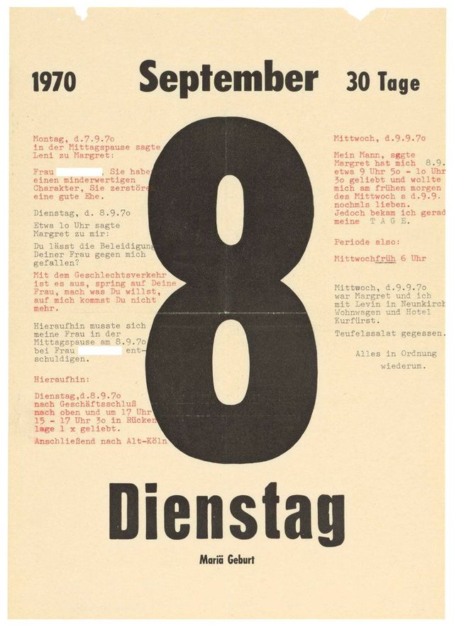 Eines Tages steht sie vor Margret im Geschäft: »Sie haben einen minderwertigen Charakter«, sagt sie. »Sie zerstören eine gute Ehe.« Margret, die immer selbstbewusster wird, ist außer sich. Um zehn Uhr sagt sie tags darauf zu Günter: »Sie muss sich bei mir entschuldigen.« Sonst sei es mit dem Geschlechtsverkehr aus, »spring auf Deine Frau, mach, was Du willst, auf mich kommst Du nicht mehr.« Günter unter Druck: Am Ende entschuldigt sich die Ehefrau in der Mittagspause bei der Geliebten. Ausnahmsweise schreibt er auf einem Kalenderblatt. Es wirkt, als würde er die Dialoge für ein Theaterstück tippen. Hier die Worte der Ehefrau, da die Worte von Margret. Und am Ende Günter: »Nach Geschäftsschluss nach oben und um 17 Uhr 15 – 17 Uhr 30 in Rückenlage 1x geliebt. Anschließend nach Alt-Köln.«