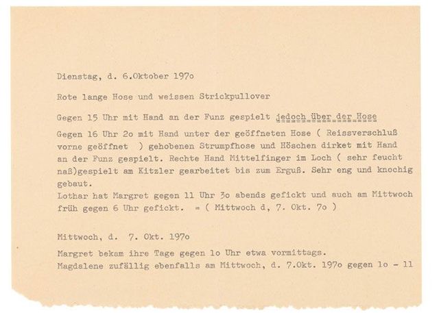 Wie ein Buchhalter notiert er: »Mittwoch, 17 Uhr 15, Beginn der Tage«. Oder »22 Uhr bis 22.50 gesteckt«. »Einweihungsfeier« nennt er den Akt, mal findet er auf dem gelben Sessel statt, vor dem Fischbecken, mal in Rückenlage und dann in »Spezialstellung«. Mal in Hotels wie dem »Nassauer Hof« oder dem »Kurfürst«, mal im Liebesnest oder sogar bei Margret in Köln-Niehl, wenn »Loli« weg ist.
