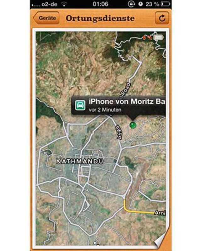 Ein Telefon auf Reisen Am Flughafen in Kathmandu trennten sich die Wege unseres Autors und seines Handys. Einen Nepalesen hat es gefreut: Er hat das Telefon gefunden und seinem Vater gegeben, der es fleißig benutzt. Der Autor hat längst ein neues Handy - auf dem er dank Ortungsfunktion sehen kann, was der Nepalese so treibt.