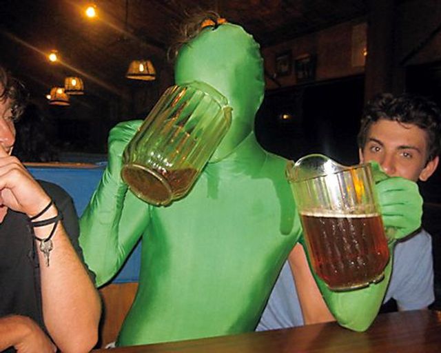 Irgendwann hat der grüne Mann einfach nur noch genervt. Es war ein Samstag in einer Bar, als plötzlich ein Typ in einem Ganzkörperanzug aus grünem Polyester auftauchte, sich zu uns an den Tresen stellte und aus unseren Biergläsern trank. Bevor wir ihn verjagen konnten, war er verschwunden, weitergezogen zur nächsten Gruppe vermutlich. Es hatte etwas Surreales. Geblieben sind ein paar verwackelte Handyfotos von einem erwachsenen Mann in einem zu engen Leibchen aus grünem Kunststoff. Und eine Frage: Was soll das?