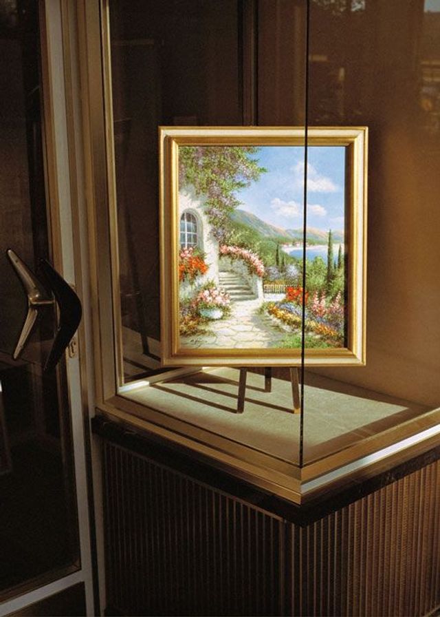 Die Sonne wies ihm seinen Weg, an einem Sommerabend im Kurpark des Heilbades Bad Salzuflen. Alexander Krack war an diesem Ort des Verweilens auf Durchreise – ein zufälliger Stopp nur, der junge Fotograf arbeitete gerade an einer Serie von Aufnahmen über die Nacht. Aber nun, im schwindenden Licht des Tages, sah er in einem Schaufenster ein Gemälde stehen, auf das die sinkende Sonne einen scharfen Lichtkegel warf. Es war ein wundersamer Anblick. Ein Gemälde, von der Sonne in Szene gesetzt wie gemalt. Krack schoss ein Foto.
