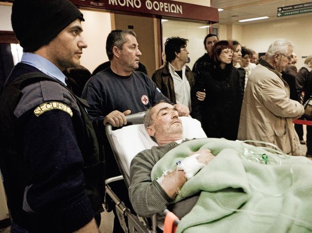 Die Notaufnahme des Papageorgiou-Krankenhauses in Thessaloniki, dem Ruf nach eines der besten Krankenhäuser des Landes, behandelt am Tag etwa 1500 Menschen. Zum Vergleich: In der Notaufnahme des Münchner Klinikums rechts der Isar werden täglich 71 Menschen verarztet, in den verschiedenen Notaufnahmen der Berliner Charité, der größten Universitätsklinik Europas, sind es 580. Der Grund für den enormen Andrang: Die Notaufnahmen griechischer Krankenhäuser haben – um Ausgaben zu sparen – nicht täglich geöffnet, sondern nur alle vier Tage. Die Kliniken wechseln sich ab. Für den Großraum Thessaloniki, dessen Einwohnerzahl in etwa vergleichbar ist mit München, bedeutet das: An einem Tag haben nur zwei Notfall-ambulanzen im gesamten Stadtgebiet Dienst. Man muss sich immer erst telefonisch erkundigen, welche gerade geöffnet ist.