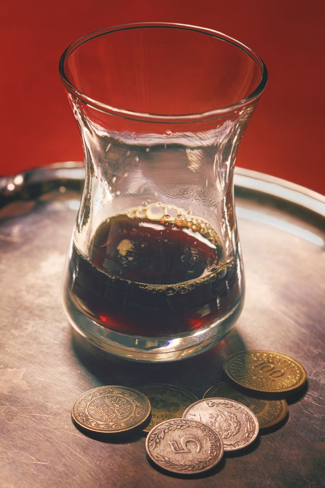 An meinem letzten Tag machte ich einen langen Spaziergang stadtauswärts, irgendwann wurden die Straßen breiter und die Menschen weniger, Gewerbe-Immobilien, Mittelklassehotels, Autobahnzubringer. Dann endlich: drei schiefe Sonnenschirme, ein paar Plastikstühle, ein Café samt verschmierter Vitrine, in dem mehrere Männer saßen, schweigend, in makelloser Stille. Ich lehnte mich an den Tresen, aber der Typ dahinter schenkte mir keine Beachtung. Er verhielt sich, als wäre ich nicht da, dabei stand ich direkt vor ihm. Ich wurde unsicher. Hatte ich etwas falsch gemacht? War ich nicht willkommen? Auf meine Frage, ob ich einen Kaffee haben könne, machte er zwar einen, aber als ich meine Hand danach ausstreckte, wies er mich darauf hin, dass dies nicht mein Kaffee sei. Jetzt war ich richtig verunsichert, aber aufgeben wollte ich auch nicht. Ich fragte noch einmal, und diesmal klappte es, eine Minute später stand ein Gläschen mit einer dampfenden pechschwarzen Brühe vor mir, einer Art Espresso. Ich kramte zwei Dinare (ca. 60 Cent) aus der Hosentasche, er nickte, steckte die Münzen ein, ließ mich stehen.